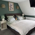 The Highland room sits under the eaves with a striking green feature wall and a peacock painting that gives it real personality. With its wrought iron bed and stylish touches, it’s a room with true character.